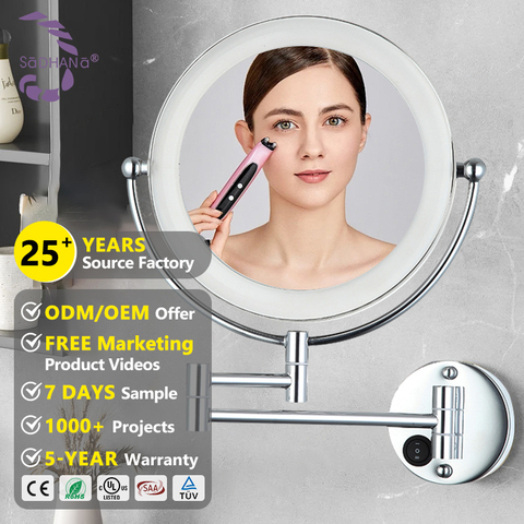 Custom Hotel moderno ha condotto lo specchio rotondo pieghevole rotante ingrandimento a parete bagno specchio per il trucco con la luce